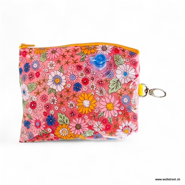 Die genoppte Gummioberfläche ist wasserabweisend und der Inhalt ist durch die Luftpolsterung stossgeschützter als in einem herkömmlichen Necessaire oder Kulturbeutel.